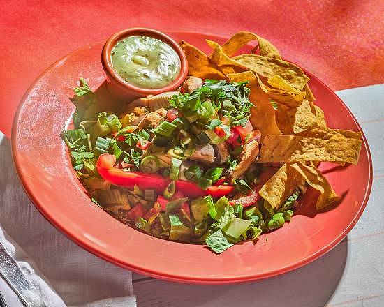 Refried beans, lettuce, cheese, corn, loose black beans, sour cream, guacamole, tomatoes, cilantro, green onions and your choice of shredded chicken, beef, pork or veggie. Garnished with tortilla chip strips.