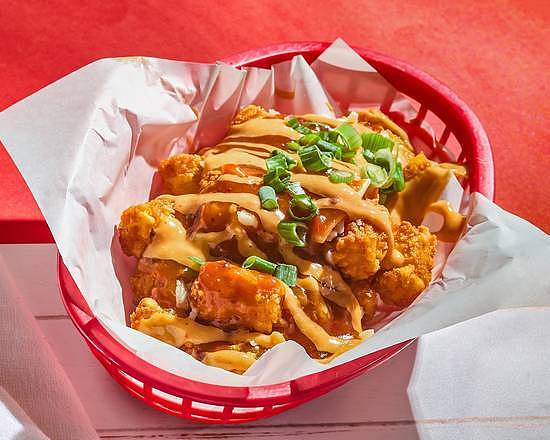 Scrambled eggs, refried beans, tater tots cheese, salsa and chipotle sauce.